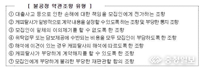 충청일보 김은경 기자 | 공정거래위원회는 8개 캐피탈사가 대출모집인과 체결하는 대출업무 위탁계약서상 약관을 심사하여 책임 전가 조항, 일방적 계약내용 설정 조항 및 일체의 이의제기 금지 조항 등 모집인에게 부당하게 불리한 7개 유형의 불공정 약관조항을 시정했다.