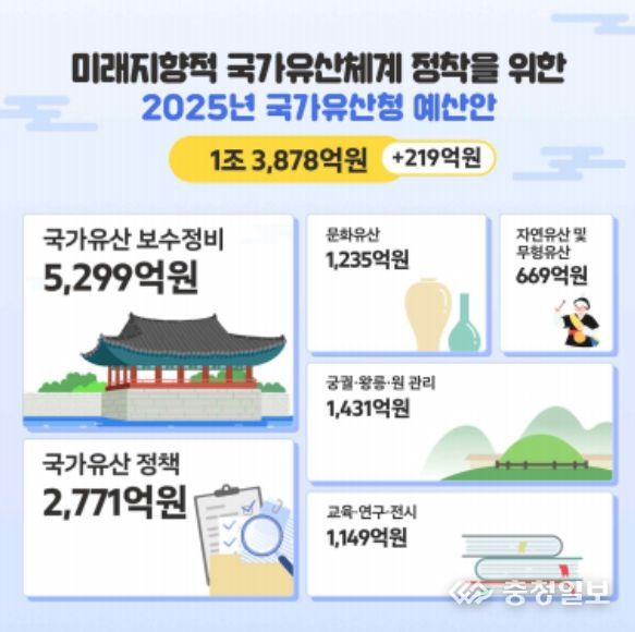 충청일보 김은경 기자 | 2025년 국가유산청 예산·기금 정부안이 8월 27일 국무회의를 통과하며 1조 3,878억 원으로 편성됐다.