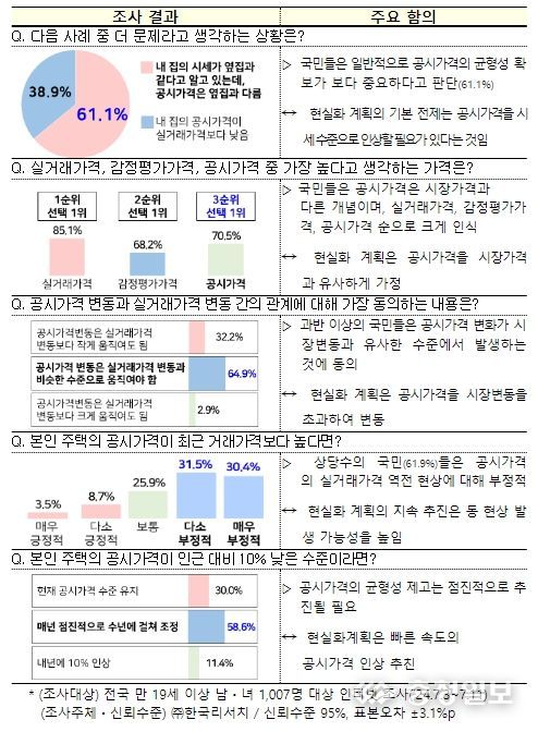 특히, 국민 인식조사를 통해 공시가격의 균형성과 안정성에 대한 사회적 요구*가 높은 것으로 확인된 만큼, 공시제도가 국민들의 일반적인 인식에 부합할 수 있도록 인위적인 공시가격 인상이 아닌 공시가격의 균형성 제고에 초점을 맞추어 공시가격 산정체계를 개편한다.