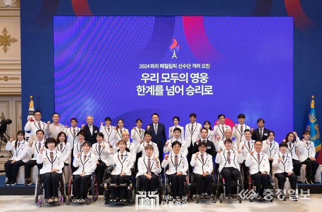 충청일보 김은경 기자 | 윤석열 대통령 부부는 9월 13일 청와대 영빈관에서 2024 파리 패럴림픽 선수단 격려 오찬을 진행했다. 대통령 부부는 거동이 불편한 선수단을 배려해 영빈관 1층에서 오찬을 함께했다. 대통령 부부가 패럴림픽 선수단을 초청해 식사를 함께하며 따뜻하게 환대한 것은 이명박 前 대통령의 2012년 런던 패럴림픽 선수단 초청 오찬 이후 12년 만이다.