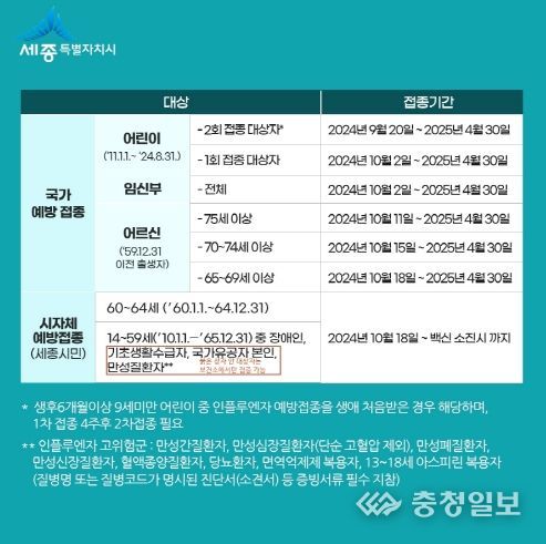 무료 접종 대상은 생후 6개월에서 13세 이하 어린이, 임신부, 65세 이상 어르신, 세종에 주소지를 두고 있는 60~64세, 기초생활수급자, 장애인, 국가유공자, 만성질환자다.