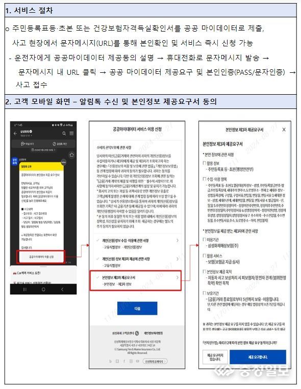 충청일보 김은경 기자 | 행정안전부는 9월부터 공공 마이데이터 서비스를 활용해 서류 없이 삼성화재 자동차보험 보상 청구를 할 수 있게 되는 것을 시작으로, 공공 마이데이터 서비스를 보험 분야로 확대한다고 밝혔다.