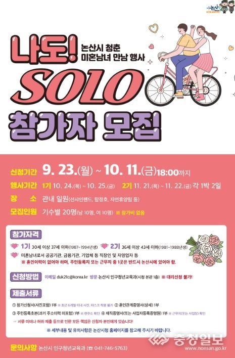 충청일보 박사현 기자 | 논산시가 청춘 미혼남녀 만남행사인 ‘나도! SOLO’ 참가자를 모집한다.