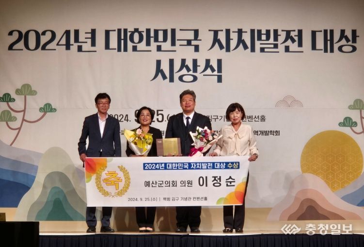 충청일보 박사현 기자 | 예산군의회 이정순 의원이 2024 대한민국 자치 발전 ‘대상’ 수상의 영예를 안았다.