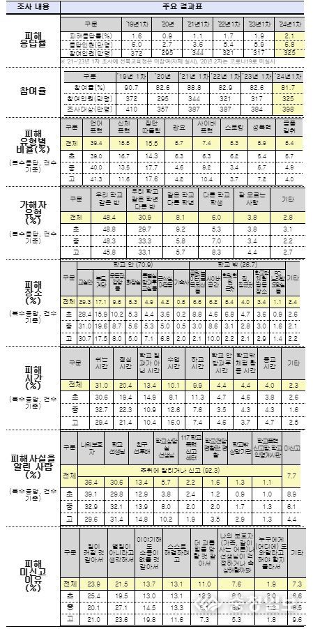 학교폭력 실태조사는 학생들의 자발적 참여를 원칙으로 온라인과 모바일을 통한 설문조사로 실시된다. 2024년 1차 전수조사 참여율은 81.7%, 2023년 2차 표본조사 참여율은 72.6%로 모두 최근 3년간 감소 추세이다.