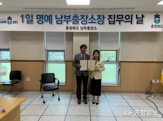 충청일보 김문호 기자 | 충북도 남부출장소는 26일 김대훈 옥천군주민자치연합회 회장을 명예 남부출장소장으로 위촉하고 '1일 명예 남부출장소장 집무의 날'을 운영했다.