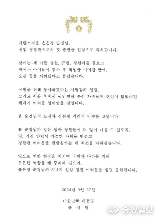 충청일보 김은경 기자 | 윤석열 대통령은 9월 27일, 신임 경찰관 314기 졸업식에 참석한 윤은정 순경과 그 가족에게 조상명 국정상황실장을 보내 축하 서한과 선물을 전달했습니다. 윤 순경은 11살, 8살, 6살 세 아들의 어머니로서 아이들을 훌륭히 키우면서도 경찰관 준비를 병행하여 이번에 신임 경찰관으로 첫발을 내딛는 뜻깊은 자리에 섰다.