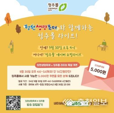 또 라이브 방송이 시작되는 오후 4시부터 ‘청주몰 알림받기’ 설정 고객을 대상으로 5천원 할인쿠폰을 제공한다. 할인쿠폰은 30일 자정까지 사용할 수 있으며, 청주몰 모든 상품에 적용된다.