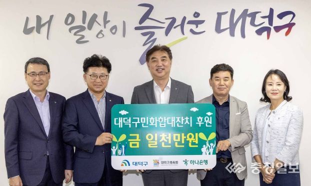 충청일보 곽채영 기자 | 대전 대덕구는 지난 26일 하나은행으로부터 ‘2024년 대덕구 구민화합대잔치’의 성공적인 개최를 위해 대덕구체육회에 후원금 1000만 원을 기탁받았다고 밝혔다.