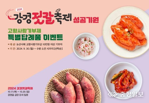 한편, 2024강경젓갈축제(부제:강경젓갈과 상월고구마는 찰떡궁합)는 오는 10월 17일부터 20일까지 강경읍 금강 둔치일원에서 개최된다.