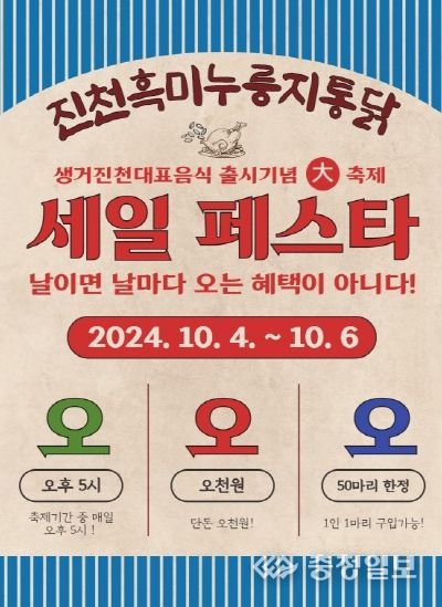 생거진천문화축제 기간 ‘오!오!오! 이벤트’로 진행되며 매일 오후 5시 50마리 한정 5천 원에 흑미누룽지통닭을 맛볼 수 있다.