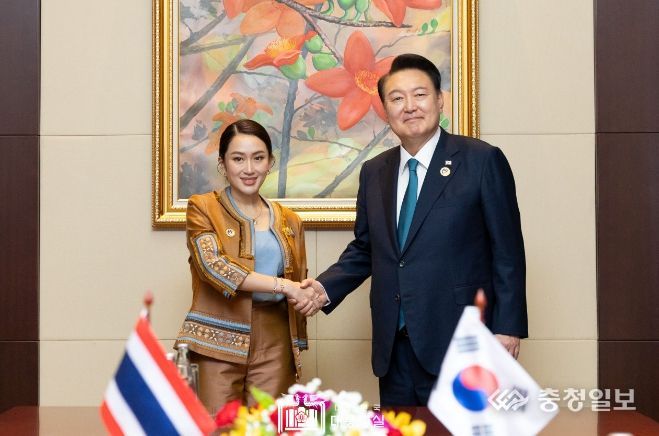 충청일보 김은경 기자 | 아세안 관련 정상회의 참석을 위해 라오스 비엔티안을 방문 중인 윤석열 대통령은 오늘(현지 시간 10. 10, 목) '패통탄 친나왓(Paetongtarn Shinawatra)' 태국 신임 총리와 첫 정상회담을 가졌다.