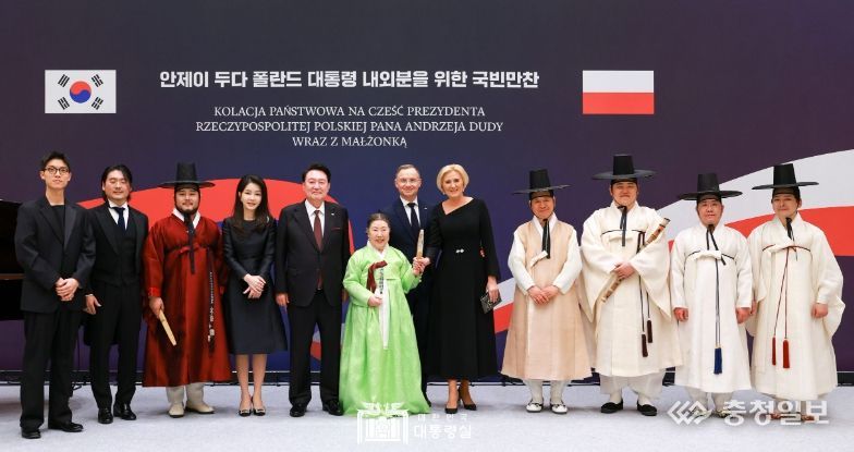 충청일보 김은경 기자 | 윤석열 대통령 부부는 10월 24일 저녁 청와대 영빈관에서 한국을 국빈 방문 중인 「안제이 두다(Andrzej Duda)」 폴란드 대통령과 「아가타 콘하우저-두다(Agata Kornhauser-Duda)」 영부인을 위한 국빈만찬을 함께 했다. 만찬에는 한국과 폴란드 관계의 발전에 큰 역할을 하고 있는 행정부, 재계, 학계 인사 50여명의 주요 인사들이 참석했다.