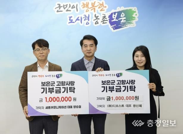 충청일보 김문호 기자 | 보은군은 지난 2일 세종커뮤니케이션 양승권 대표와 ㈜디포스트 황신혜 대표가 보은군청을 방문해 각각 고향사랑기부금 100만 원을 기탁했다고 밝혔다.