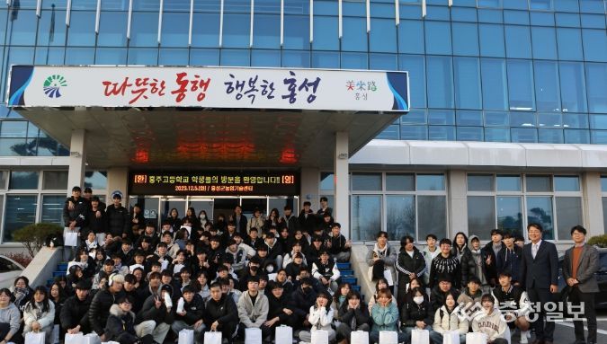 충청일보 박사현 기자 | 홍성군농업기술센터 마당이 젊은 웃음으로 가득찼다. 올해 대입 수능을 마친 150명의 홍주고등학교 3학년생들이 체험 학습을 위해 5일 농업기술센터를 찾아왔기 때문이다.
