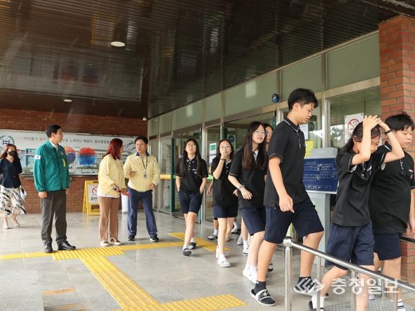 충청일보 김문호 기자 | 충주시는 22일, 충주 중앙중학교에서 학생과 교직원 등 400여 명이 참여한 공습 대비 민방위 대피훈련을 실시했다.